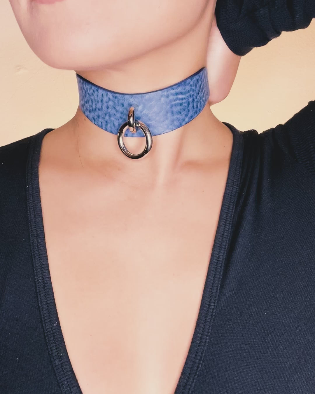 Blue textured leather day collar with silver metal ring on white background, leather collars