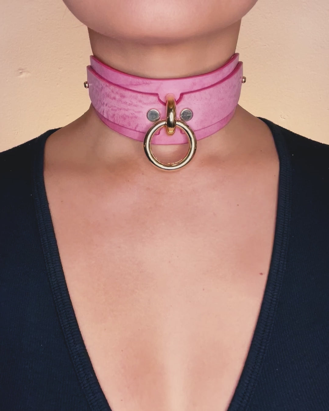 Pink full-grain leather day collar with gold buckle and central O-ring, leather collars