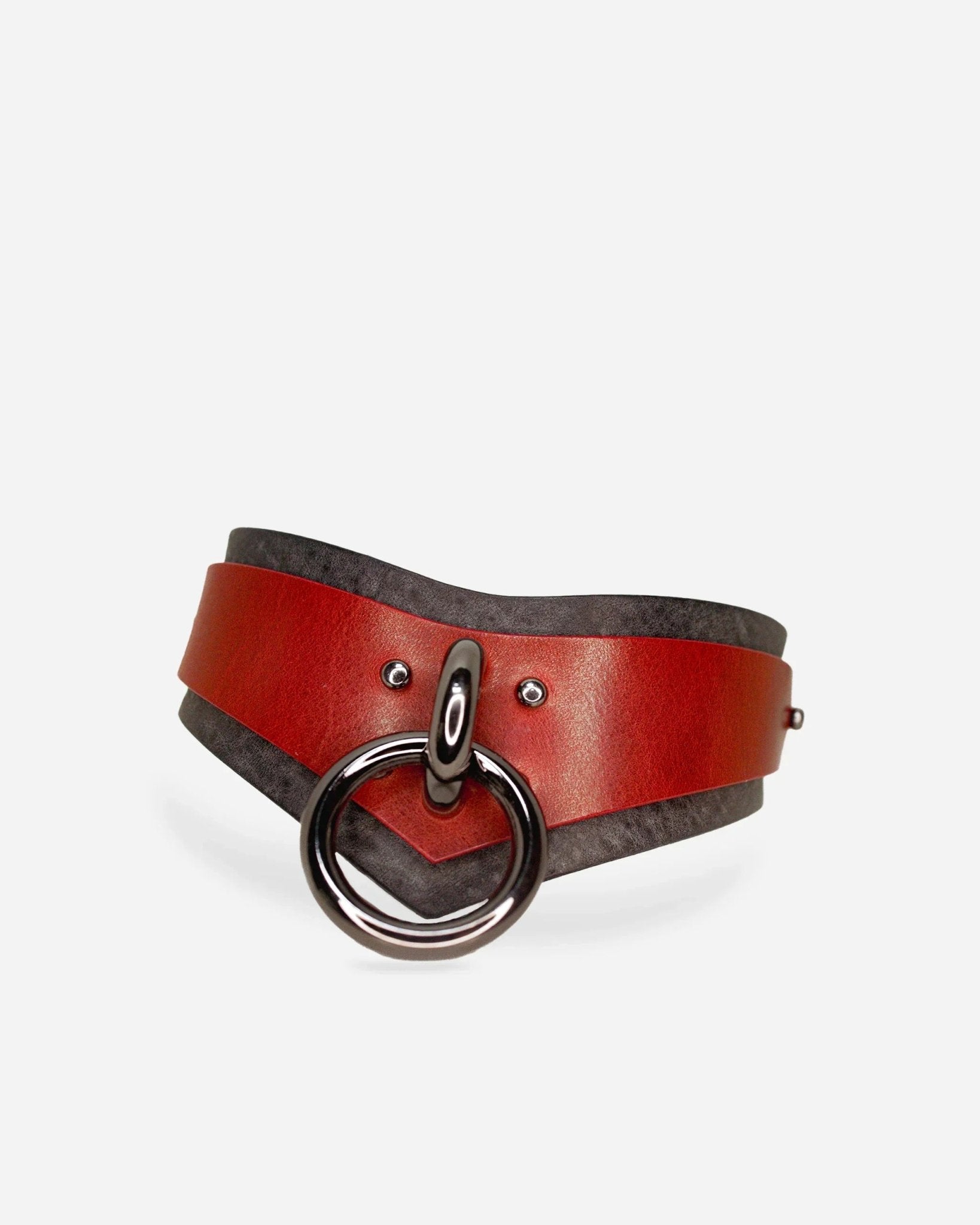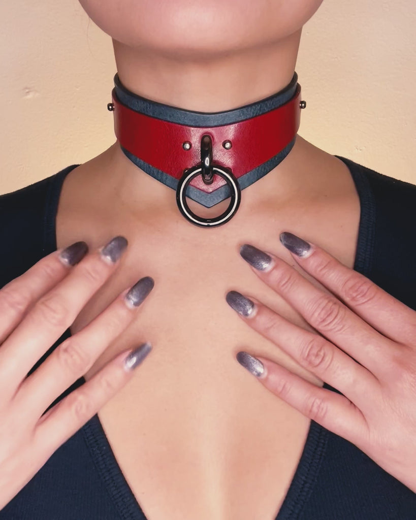 Red and black leather day collar with metal rings, showcasing full-grain leather craftsmanship