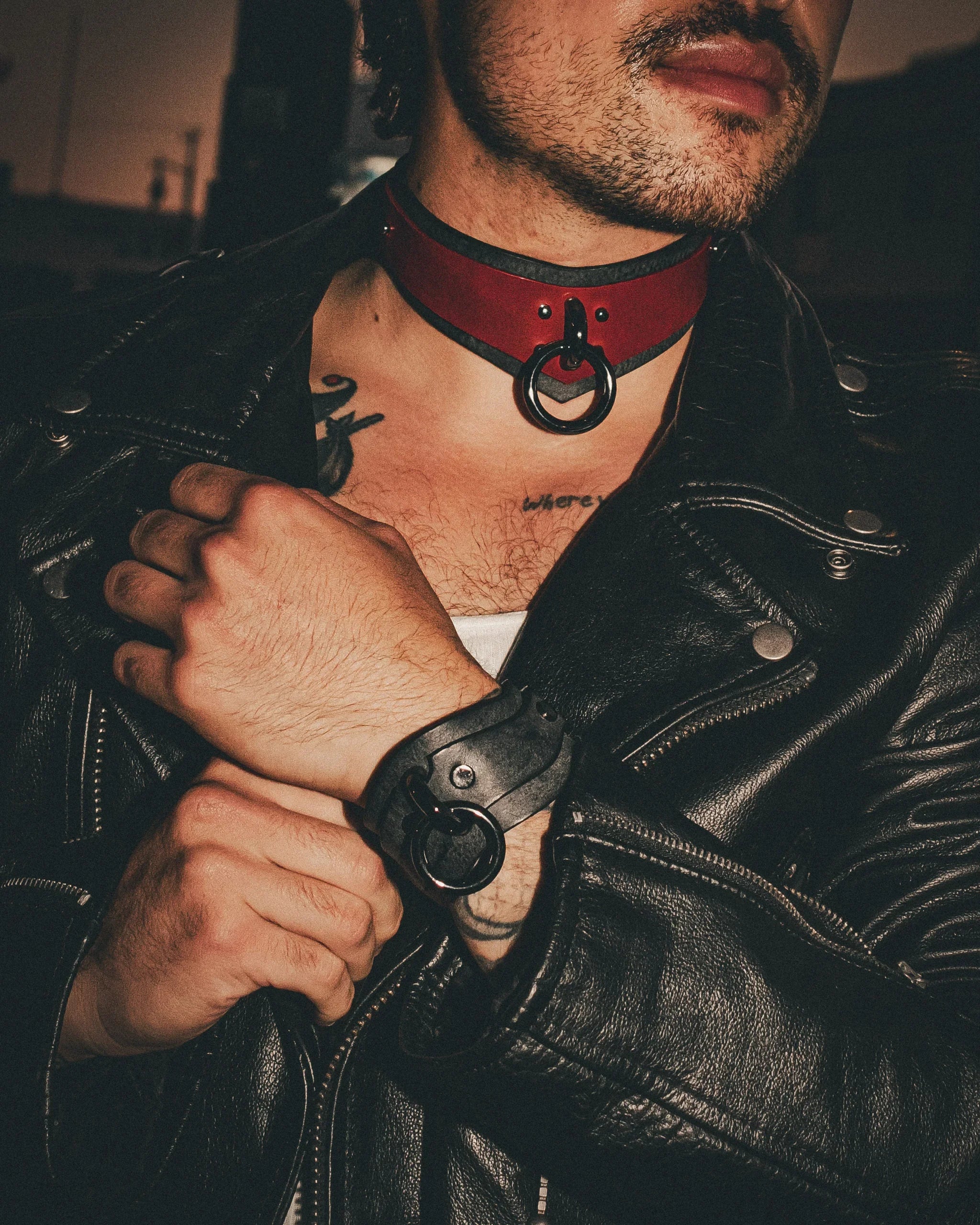 Tattooed man wearing a white tank top, red leather day collar, and black leather wrist cuffs against a red background