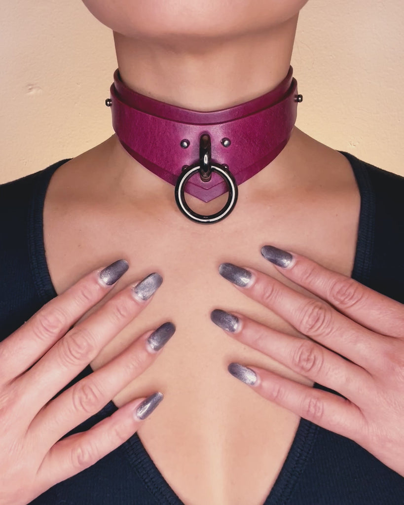 Close-up of a model wearing a magenta leather day collar with a large metallic ring detail